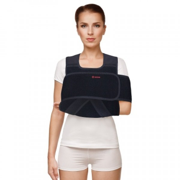 Состоит из двух частей: основная муфта удерживает предплечье под углом 90° к плечу (регулируется двумя ремнями); разъемный широкий пояс фиксирует плечо к туловищу. Основную часть изделия можно использовать отдельно для легкой фиксации на поздних этапах восстановительного лечения. Выполнен из воздухопроницаемого неопрена, обеспечивающего комфортные условия при длительном и непрерывном использовании. Универсален по размеру.
